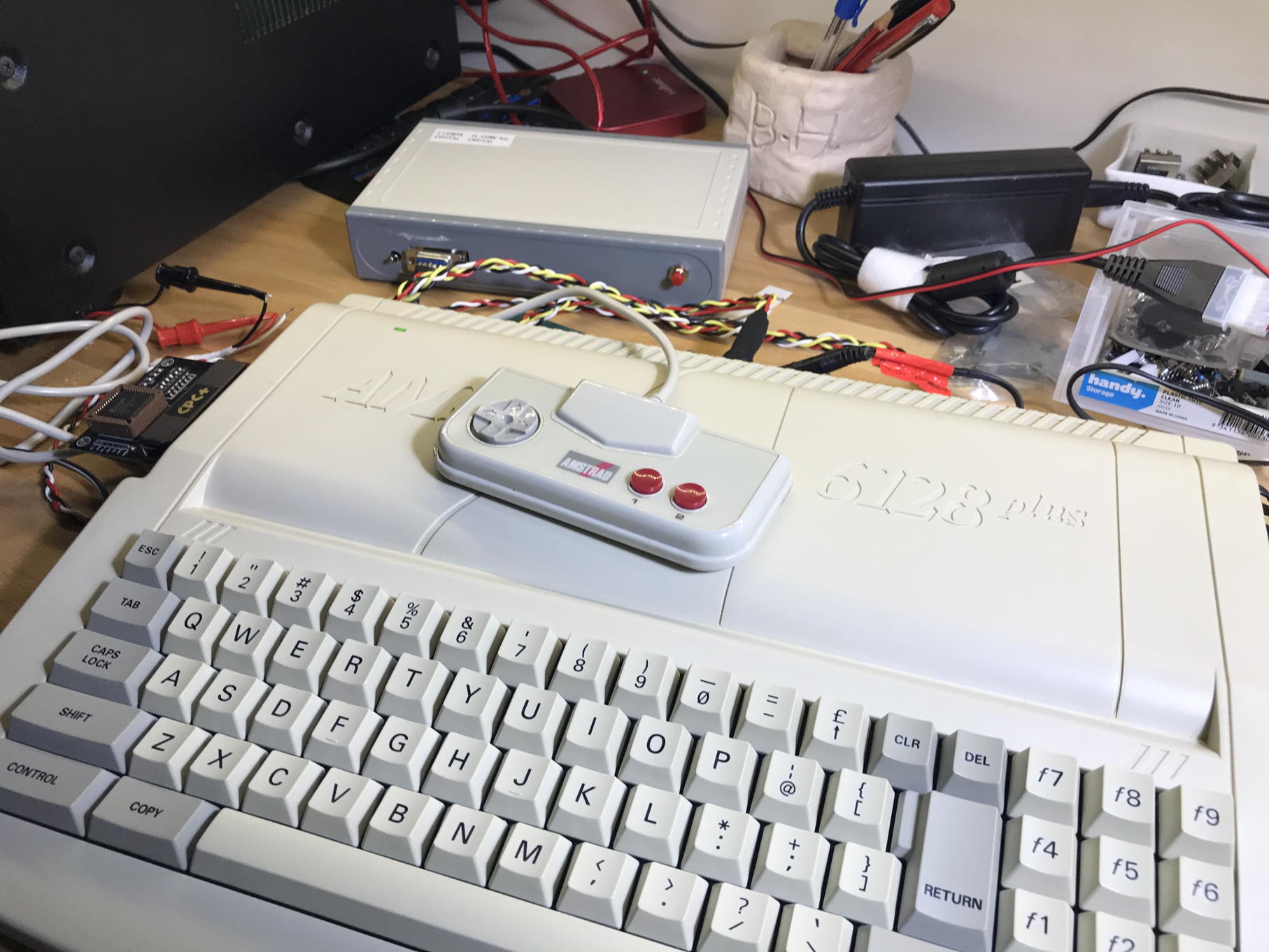 CGA-to-VGA converter troubleshooting - g67wjjk - 26-12-2020 Hi, Discussing with Ewan via email but thought it might be useful to post in the forum for posterity. Bought a CGA-to-VGA converter a few years ago but never got around to using it, but my plan was to use it with my Amstrad CPCs, BBC Model Bs and some DOS machines once I was properly set-up. Finally getting myself organised. The Amstrad CPC and BBCs use the same analogue RGB output via 6-pin DIN: Pin 1 = red Pin 2 = green Pin 3 = blue Pin 4 = composite sync Pin 5 = ground Pin 6 = luminance There didn't seem to be any documentation about connecting CPC to CGA, so I came up with this wiring scheme: Amstrad pin 1 (RED) -> CGA pin 3 Amstrad pin 2 (GREEN) -> CGA pin 4 Amstrad pin 3 (BLUE) -> CGA pin 5 Amstrad pin 4 (SYNC) -> CGA pin 8 (H_SYNC) Amstrad pin 5 (GND) -> CGA pin 1 Amstrad pin 6 (LUM) -> CGA pin 6 (INTENSITY ... although, incorrect/irrelevant?) I left CGA pins 2 (extra GND), 7 (reserved?) and 9 (V_SYNC) unconnected. Input voltage was 8V and it was drawing about 1/3 A. The GBS8200 OSD worked but it continued to say "no input". I also tried with a Commodore 128D with straight-through DB9 cable. I confirmed the cables using an Amstrad EGA display - both my CPC-to-CGA and the one I used for the C128D. The Amstrad displayed slowly rolling gibbersh (no V_SYNC), but the colours were correct (yellow text on blue background). The C128D display was perfect. I also want to use it on my Amstrad CPC6128+ that has an 8-pin DIN. Brett. For interest, this is what the Amstrad CPC464 output looked like on the EGA display using that wiring scheme. RE: CGA-to-VGA converter troubleshooting - g67wjjk - 26-12-2020 It seems that I had a DIY kit. Removing the RGB+I-to-Analogue adaptor board I immediately noticed some dodgy soldering by, ahem, me. Pin 9 of U2 (MAX4619 analogue multiplexer) was unsoldered, and the middle pin of the 7805 (ground) looked dodgy too (although the chips seemed to be powered okay). RE: CGA-to-VGA converter troubleshooting - g67wjjk - 26-12-2020 Making progress. Now I get an image when I wiggle my dodgy DIN plug on the Amstrad ... but red-on-blue instead of yellow-on-blue. And of course the image is lost if I stop wiggling. RE: CGA-to-VGA converter troubleshooting - someone - 26-12-2020 (26-12-2020, 05:47 PM)g67wjjk Wrote: It seems that I had a DIY kit. Removing the RGB+I-to-Analogue adaptor board I immediately noticed some dodgy soldering by, ahem, me. For future projects with similar sized PCB pads someone suggests that you use a thinner gauge of solder such as 0.71mm and a suitably wide chisel or double chisel soldering tip. Investing in a bottle of suitable liquid flux and flux remover is also very useful. RE: CGA-to-VGA converter troubleshooting - g67wjjk - 27-12-2020 Someone has good advice - I've improved since and I finally did get a pot of proper flux that I use all the time now. Still hate soldering DIN plugs though. More progress today. Made a new DIN-to-DB9 cable. More stable image but shifted to the right. Strapping the H_SYNC or V_SYNC invert pins shifts the image left but flickers more. Colours are still wrong though - Ewan pointed out this was because green was missing. The C128D shows a perfect image but also incorrect colours. This is using a different cable so the green must be missing somewhere internally ... although, maybe I should also check the VGA cable I'm using. RE: CGA-to-VGA converter troubleshooting - g67wjjk - 27-12-2020 Used an oscilloscope to check the R/G/B output from CGA board to the GBS 8200 ... R & B showed expected activity, nothing on the G output. Then I noticed some haphazardly soldered inductors that appeared to be on the R/G/B signal paths: L1 - red - C5 L2 - green - C4 L3 - blue - C3 There was activity on L2 but dodgy continuity between L2 and the green wire. Re-soldered ... with a dab of flux ... and the colours are now perfect! Happy. Remaining problem is the image is right-shifted. Strapping either V_SYNC or H_SYNC invert pins moves the image to the left (but not fully), however the image becomes more unstable - even more so when loading software from tape. So still some troubleshooting to do. I'll also hook up a BBC Model B to compare. Success! Ewan suggested pressing the auto-adjust on the GBS 8200 and also tying the unused V_SYNC on the CGA side to ground. Working perfectly now! Final configuration: Code: CGA pin 1 (GND) -------> Amstrad pin 5Amstrad pin 6 (LUMINANCE) was also unconnected. The H_SYNC invert pins on the CGA adaptor board were strapped and then auto-adjust on the GBS 8200 was executed. BIG THANKS to Ewan for taking the time over this weekend to help me get it sorted! RE: CGA-to-VGA converter troubleshooting - g67wjjk - 27-12-2020 This is the end result. [1] Fixed my soldering issues: 7805 ground pin, MAX4619 pin 9, inductor L2 for green output signal [2] Increased panel hole for DC power plug to 11.5mm so my inline power switch will fit [3] Added switch for C128 Luma fix [4] Added switch for H_SYNC invert for Amstrad CPC (and BBC Model B?) [5] Added push button for auto-adjust in case I need to force a re-sync when switching computers I'm very happy and really appreciate Ewan's help over the weekend. Brett. Working on Amstrad CPC Plus range - g67wjjk - 27-12-2020 Confirmed working on Amstrad CPC+ range as well - tested on Amstrad CPC6128+ These use an 8-pin DIN instead of the 6-pin DIN on the regular CPC range as they output L/R audio as well. But otherwise configuration is the same, except H_SYNC invert is inactive (edited) instead of active. RE: CGA-to-VGA converter troubleshooting - someone - 27-12-2020 Excellent stuff. Are your CPCs "PLUS" models with PSG DMA? RE: CGA-to-VGA converter troubleshooting - g67wjjk - 27-12-2020 (27-12-2020, 07:36 PM)someone Wrote: Excellent stuff. I believe this is standard in the Plus models - this is the first time I've powered it on and tried out the cartridge software. Although I guess I could've wired up an 8-pin to 6-pi