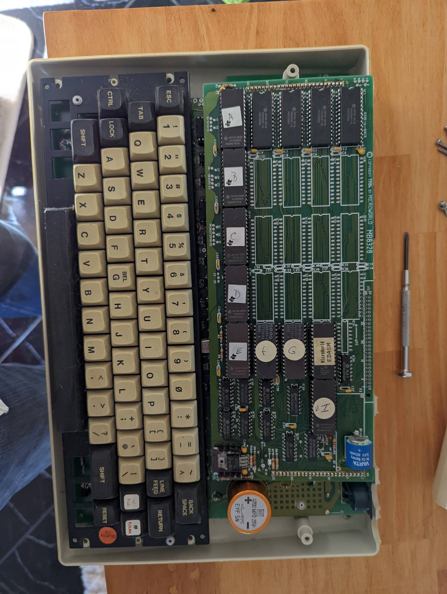 1. Despite the listing saying 16K, (as noted in the intro channel) the unit has been upgraded to PC85/colour. So from what I can see, the top board - its got 32K ram and a bunch of ROMS (and another spare rom stored inside the case!)