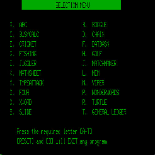 The disk uses AUTOBAS to load Basic ver 6.22e and then automatically loads and runs AUTO.MWB, which is the menu as above. The disk also has the files for a Premium or 256TC on it so left them there, you just need to change the System track to suit your system. Most of the programs we have already spread across disks which are Educational, Puzzles and Games. However, General Ledger is new, written by Alan Gasson for the Microbee. We have the manual in the repository, microbee_cashbook_and_general_ledger_manual.pdf, so check it out for further information -