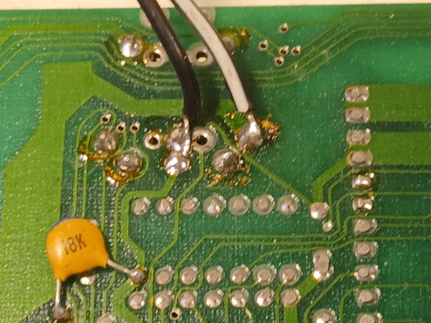 Someone has soldered a "temporary" power cable to the underside of the main board.