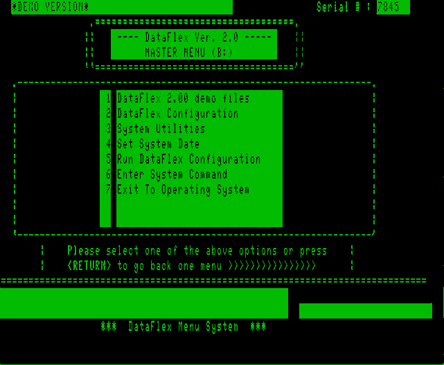 This is Dataflex ver 2.0/e released in 1984 by Data Access Corporation, Florida, USA. Dataflex is a relational database management system and fourth-generation programming language. This is fully functional DEMO version with this start screen :