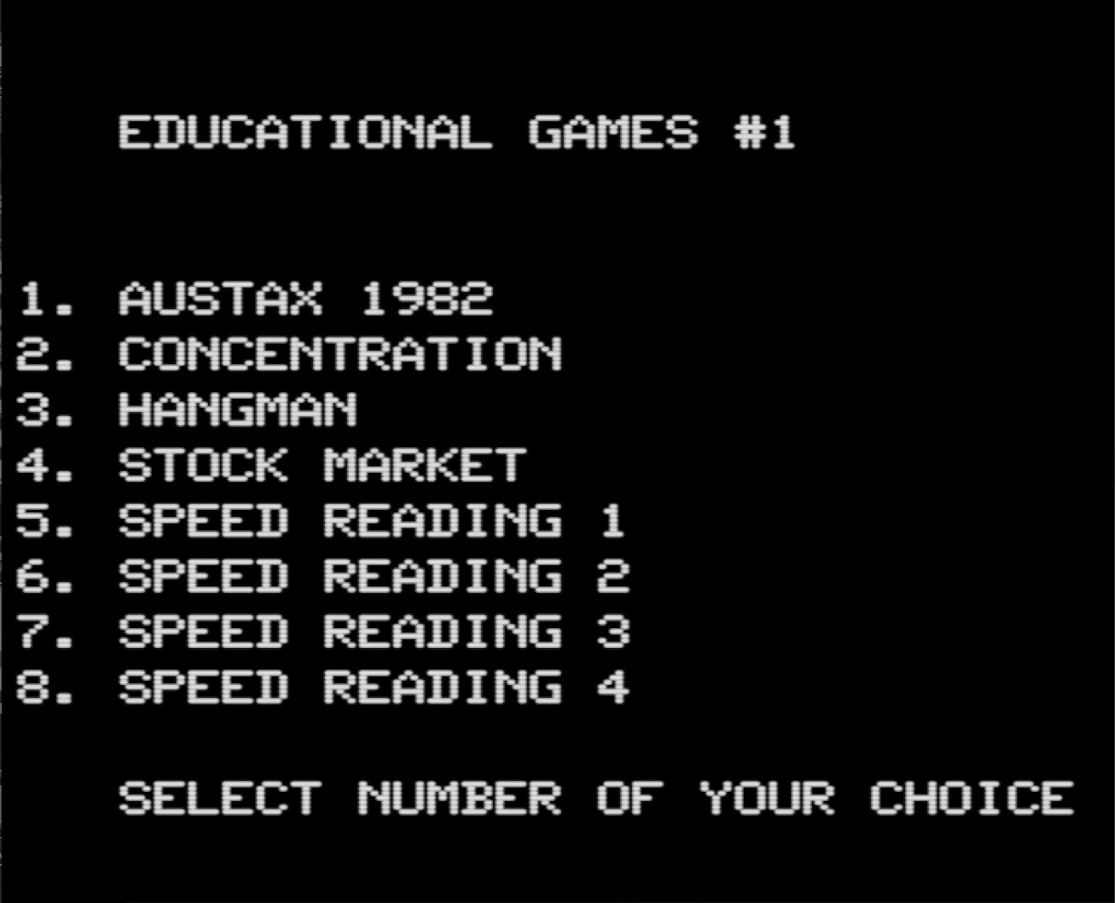 All the Dick Smith Electronics tapes from kimjohn have not been recovered before with most being Educational in nature. CONCENTRATION & HANGMAN were on either side of one tape and SPEED READING 1 & 2 were on one tape and 3 & 4 on another. AUSTAX 1982 and STOCK MARKET were in individual tapes. It would be interesting to put in some of todays figures into AUSTAX and see what you would have paid in tax at 1982 rates. I will eventually put all these programs on a single disk image when I'm able to convert each to a BASIC listing.
