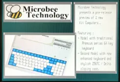 There are 2 new Microbee kit computers in the advanced stages of development.For full details on the progress of development please read the dedicated thread on the Microbee Technology Forum -> <HERE>Previously known (at the start of development) as the Classic-Plus, the design has changed into being the heart of 2 new models (names to be announced just before release).Renamed to represent the significant changes and added features of the designs over the original Classic-Plus target spec, these new models include the following features:•Fully backwards compatible with older Microbee models•Dual processor design•Z80 running at 3.375Mhz, 10 Mhz or 20 Mhz•MC68SZ328 (Dragonball SZ) MC68000 compatible processor running at 66Mhz•Dual Boot - Microbee ‘Z80’ Mode, or ‘M68K’ mode•Floppy disk emulation makes use of disk images stored on an SDcard•Hardware Floppy disk interface (Option)•Microbee Premium series graphics compatible•Enhanced 4 bit plane extended graphics •Hardware cursor / sprite layer•Dual sound FIFO for stereo sound output•USB mouse interface•1Mbyte ‘Z80’ space RAM•Loadable boot ‘RAM’•32Mb SDram & Flash ROM for ‘M68K’ space•Fully UpScaled video out via HDMI (no need for 15Khz compatible monitor or external upscaler)•Sound out via HDMI or 3.5mm jack•Standard Microbee Serial & Parallel ports•2 models (shown at right) 64 key original keyboard layout & new 98 key keyboard layout in deluxe case.Want to keep up with the latest news & launch date information?Join our email ‘ New Models Interest List ‘ <- Click on the Link.